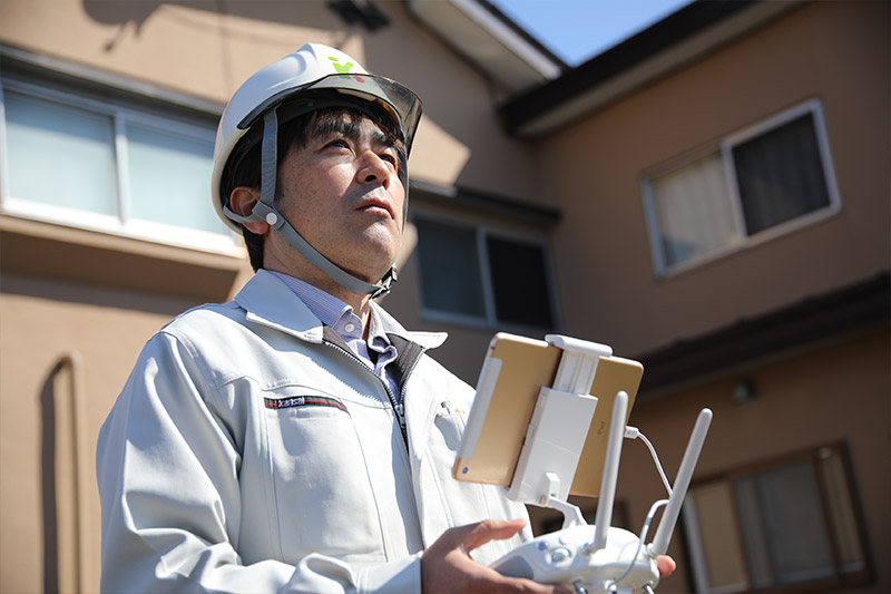 塗装リフォームの現場調査の際に、現場によって足を踏み入れるのは危険であると判断した場合や、ドローンを活用しなければ調査できない細かいポイントがある場合に使用しています。